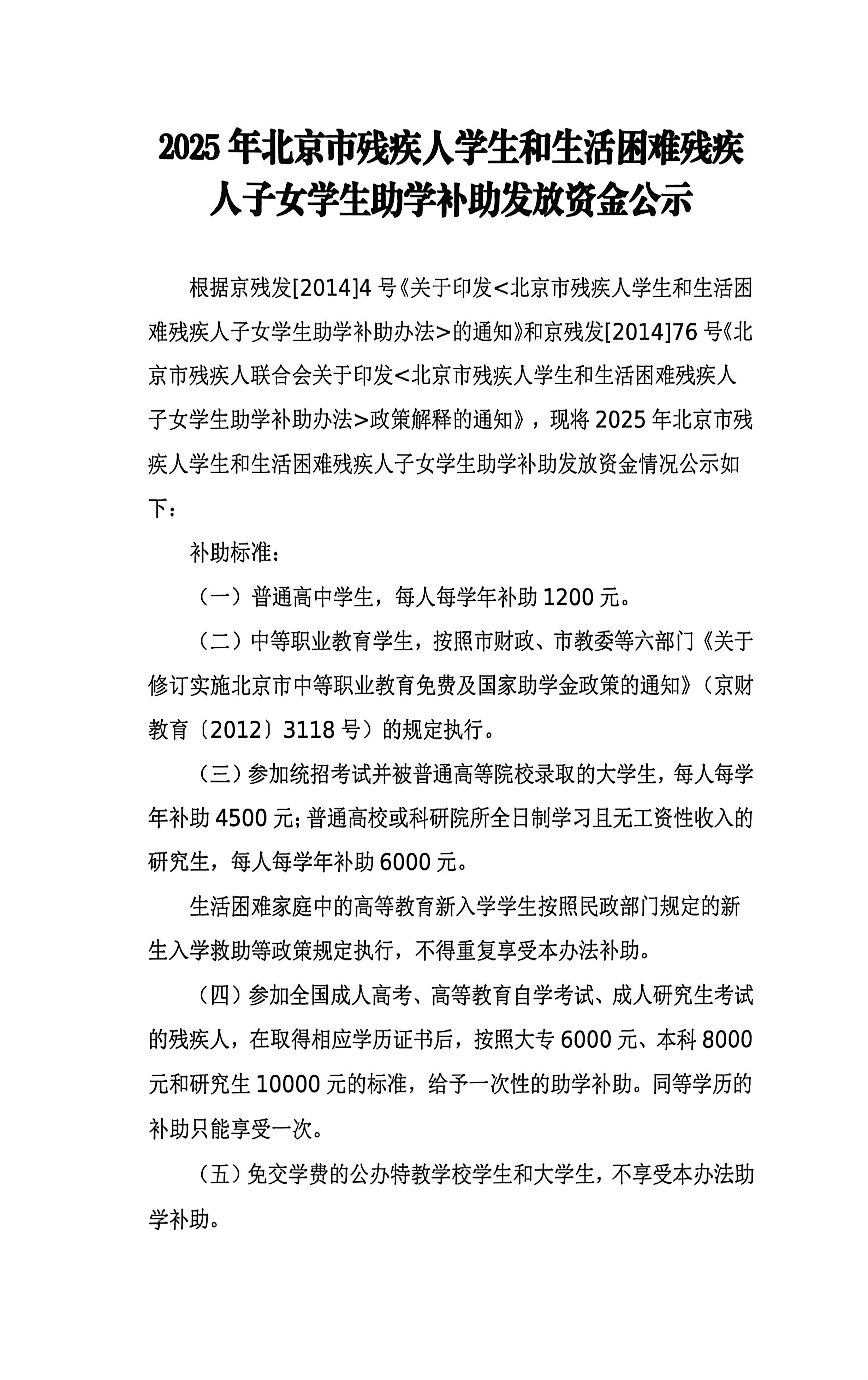 2025年北京市残疾人学生和生活困难残疾人子女学生助学补助发放资金公示