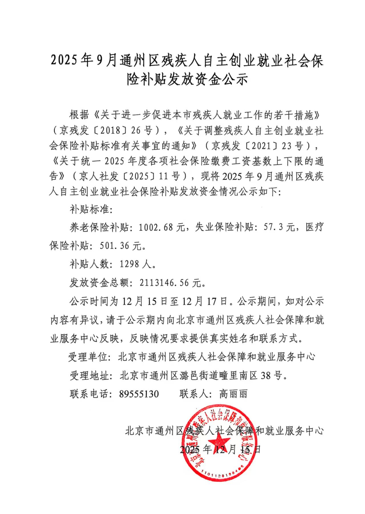 2025年9月通州区残疾人自主创业就业社会保险补贴发放资金公示