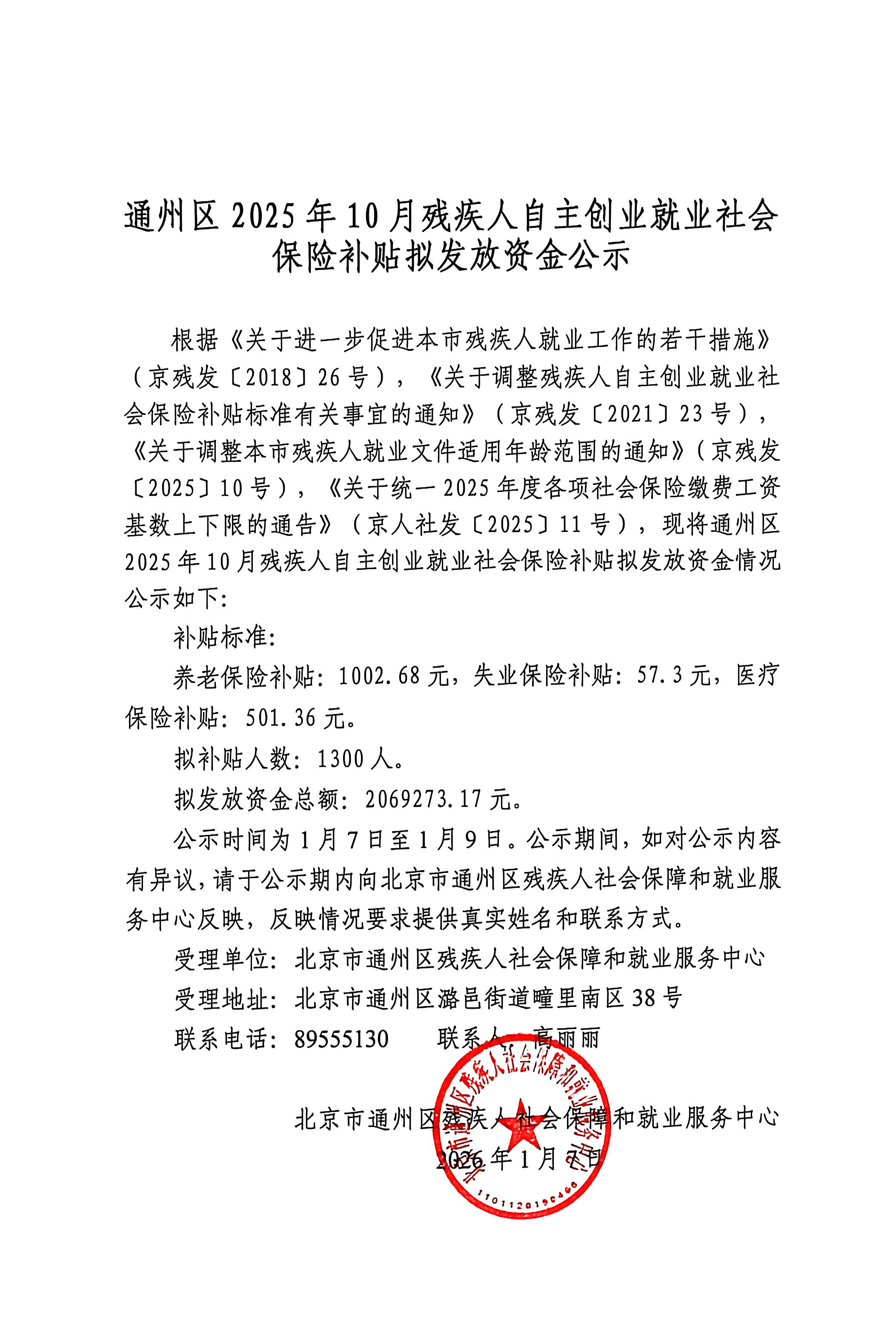 通州区2025年10月残疾人自主创业就业社会保险补贴拟发放资金公示