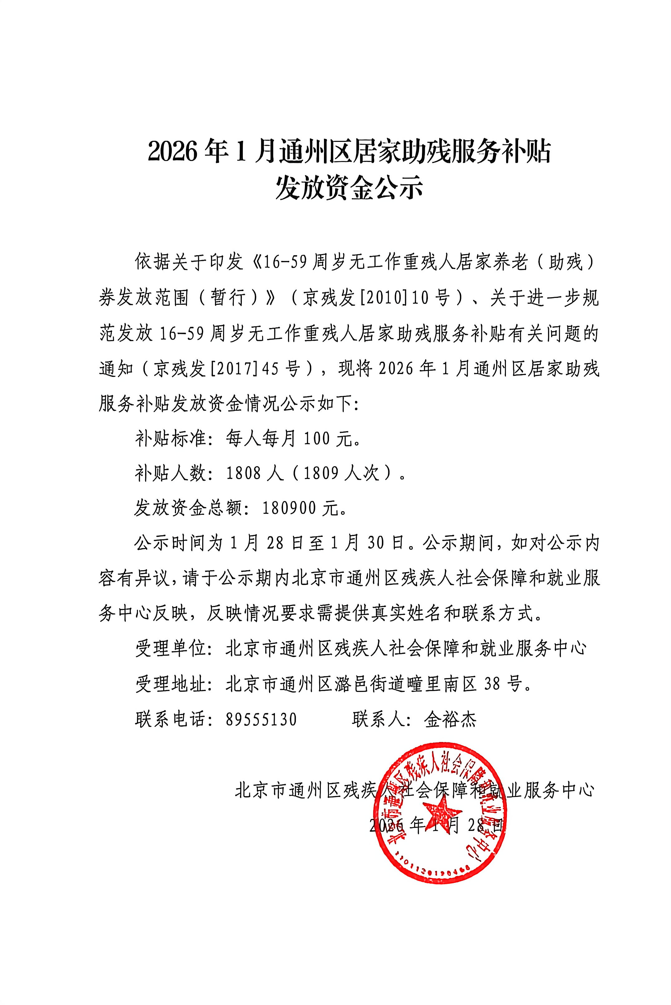 2026年1月通州区居家助残服务补贴发放资金公示