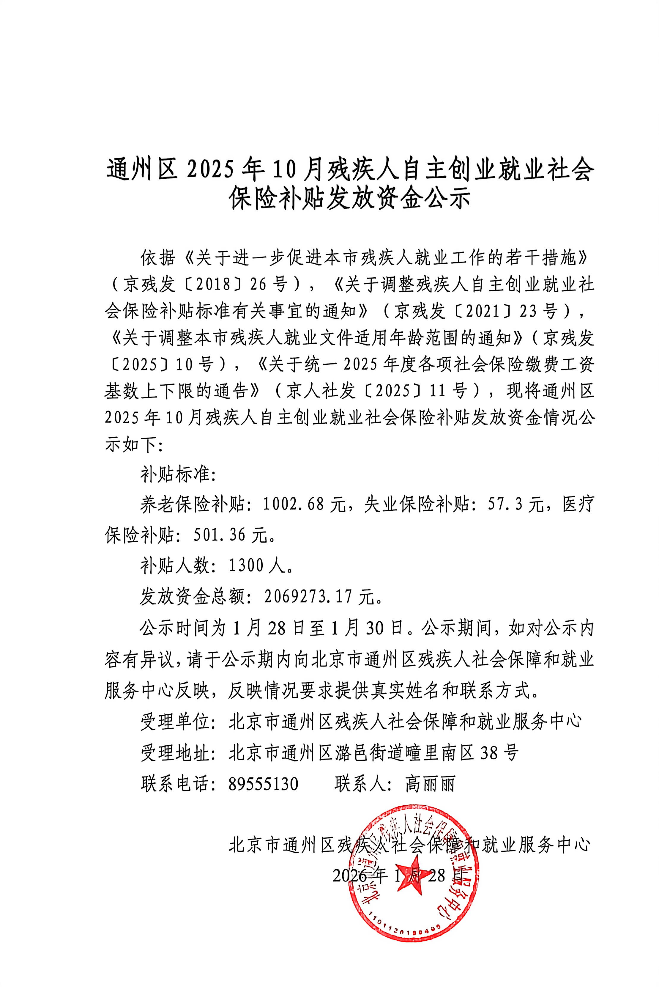 通州区2025年10月残疾人自主创业就业社会保险补贴发放资金公示