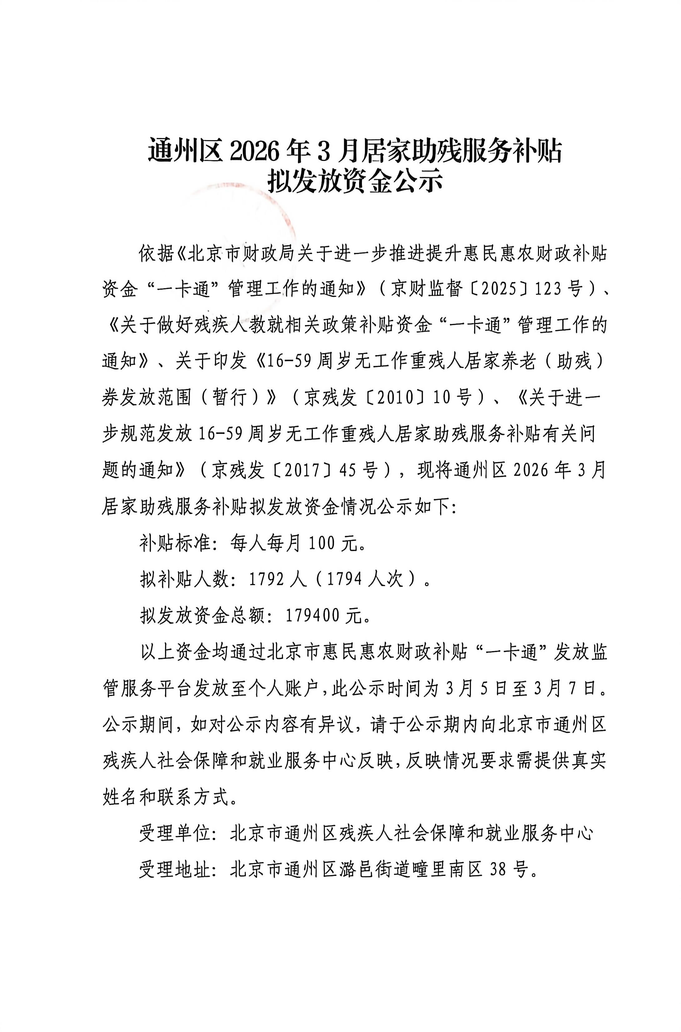 通州区2026年3月居家助残服务补贴拟发放资金公示