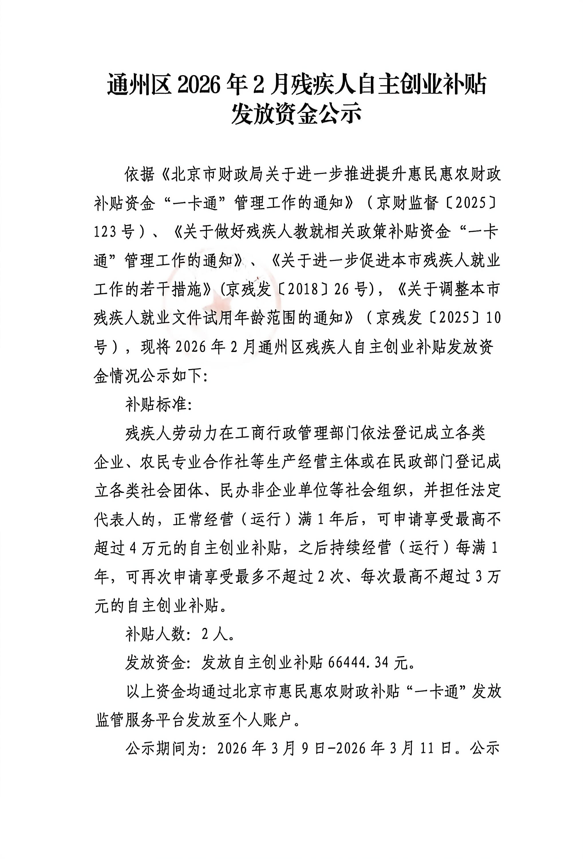通州区2026年2月残疾人自主创业补贴发放资金公示