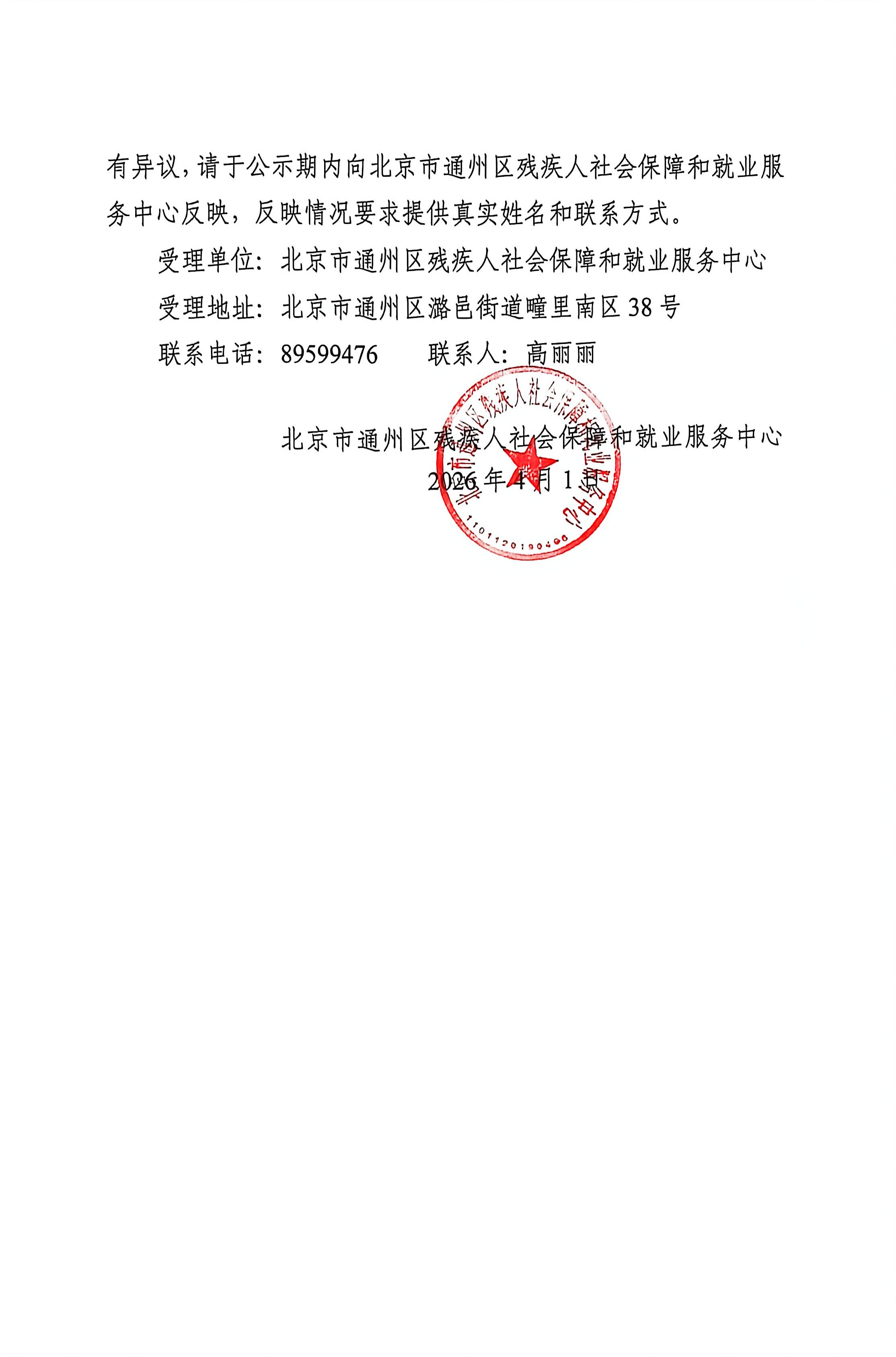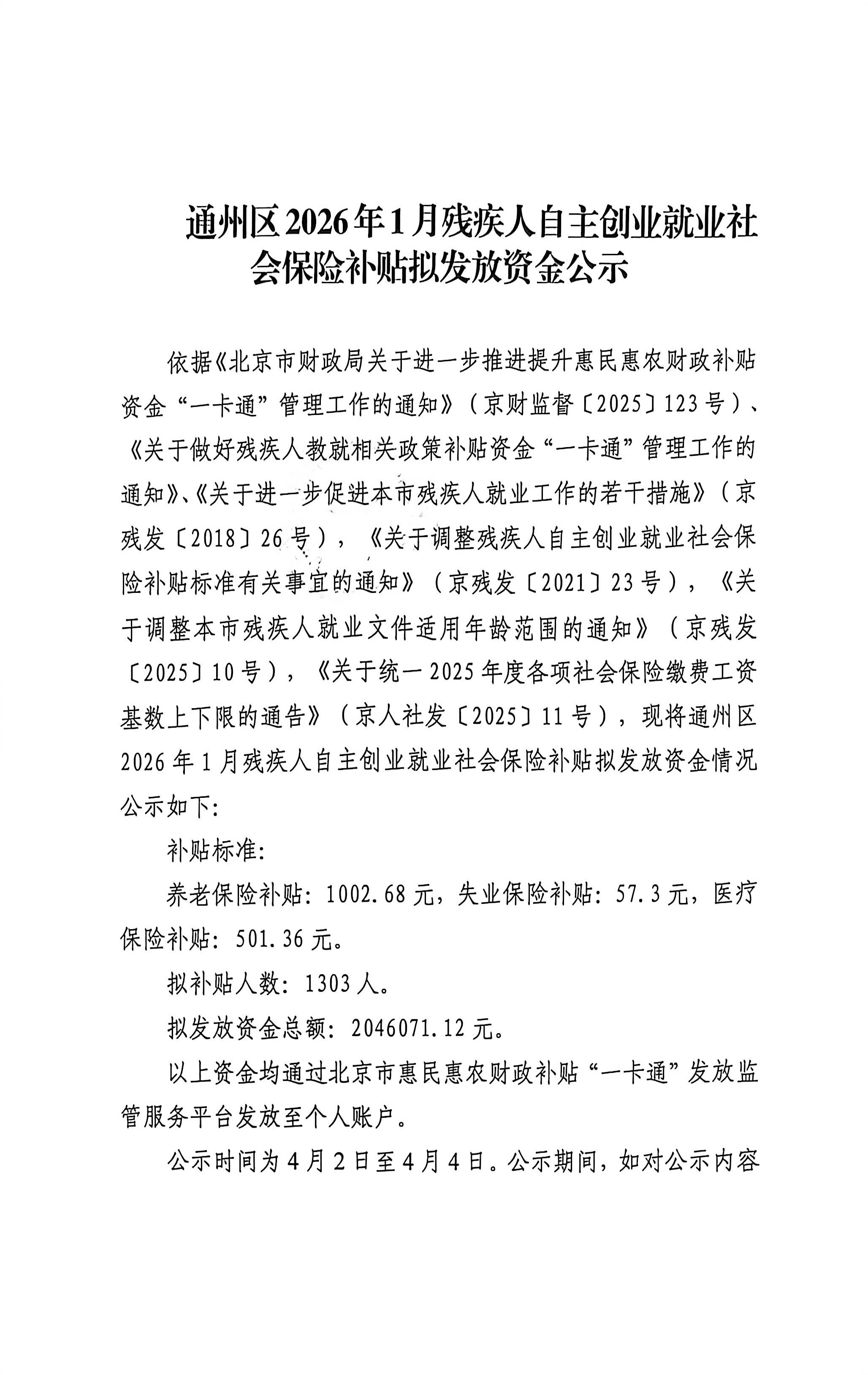 通州区2026年1月残疾人自主创业就业社会保险补贴拟发放资金公示