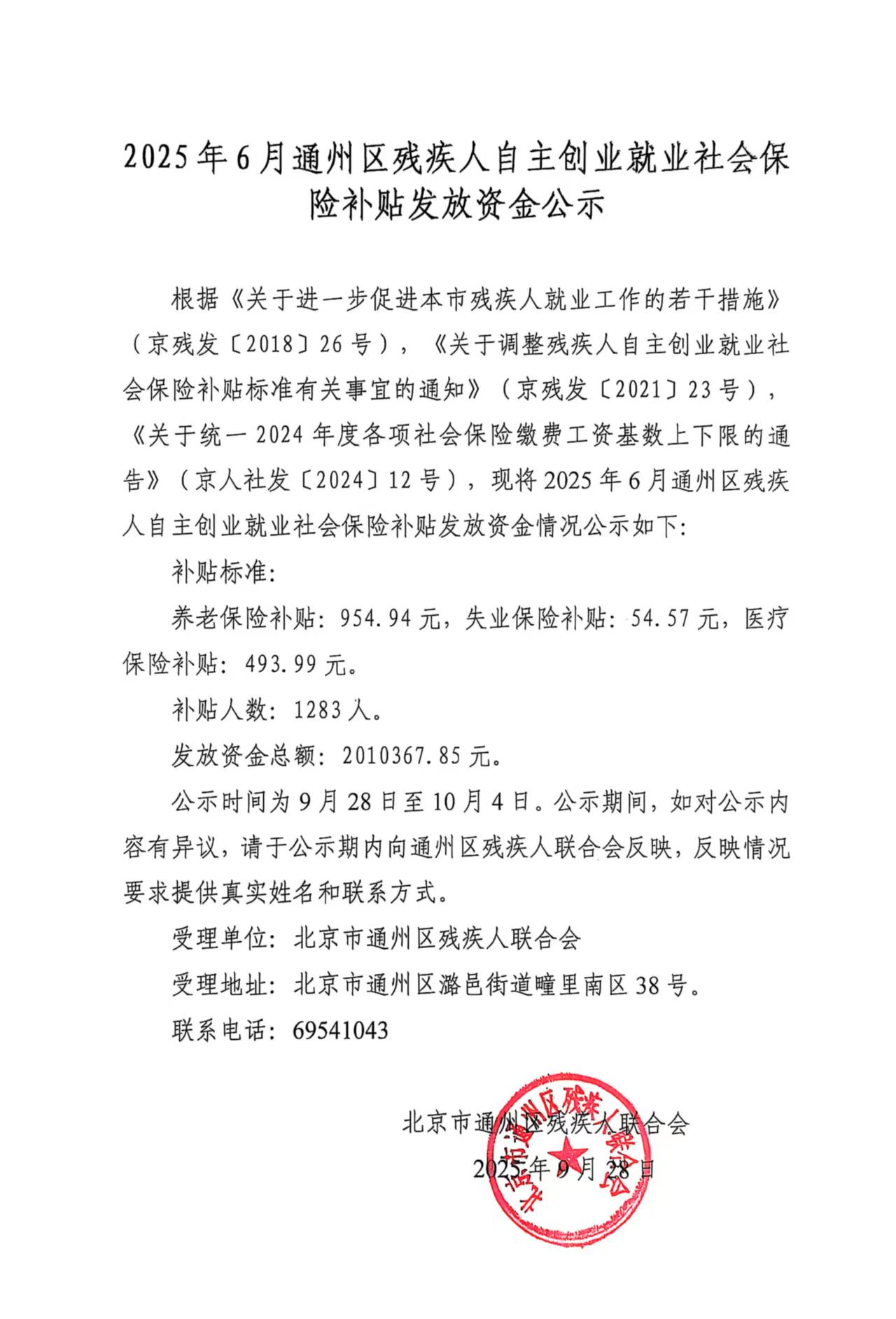 2025年6月通州区残疾人自主创业就业社会保险补贴发放资金公示