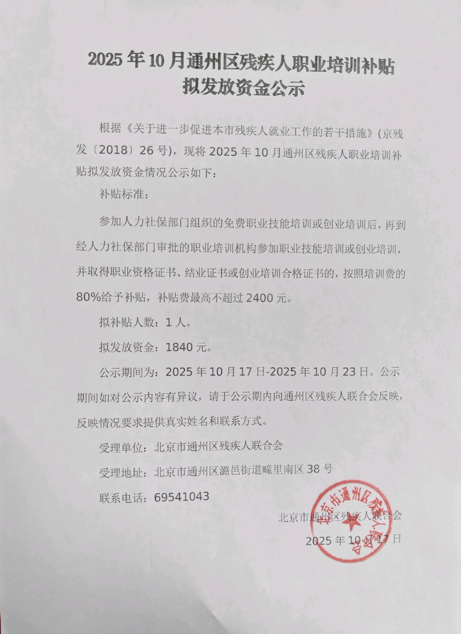 2025年10月通州区残疾人职业培训补贴拟发放资金公示