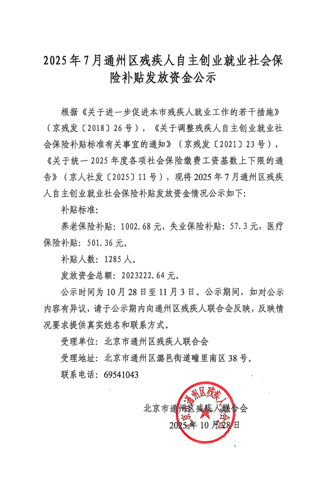 2025年7月通州区残疾人自主创业就业社会保险补贴发放资金公示