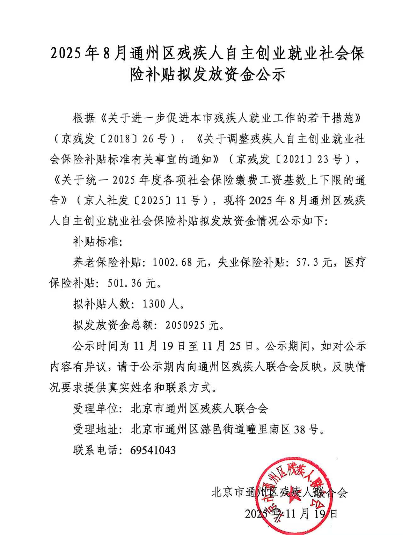 2025年8月通州区残疾人自主创业就业社会保险补贴拟发放资金公示