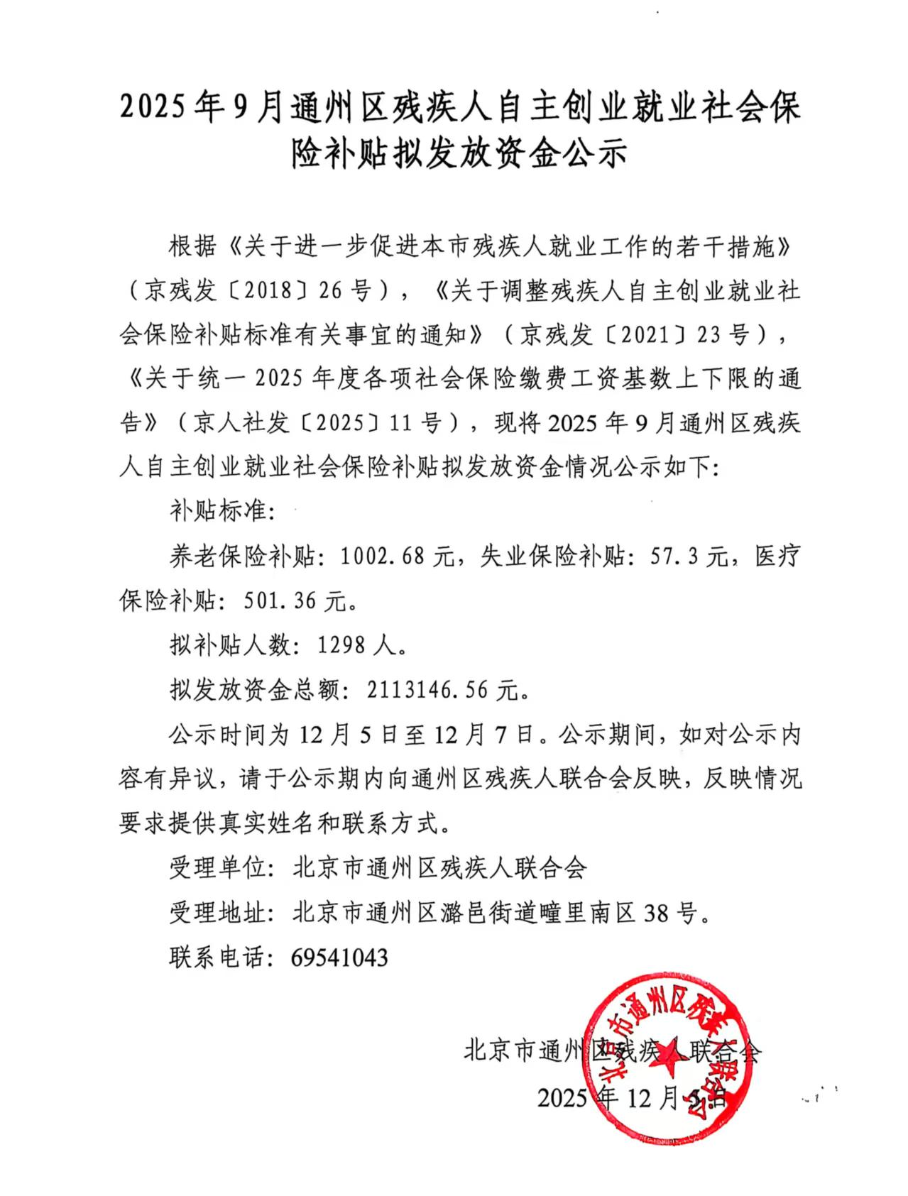 2025年9月通州区残疾人自主创业就业社会保险补贴拟发放资金公示
