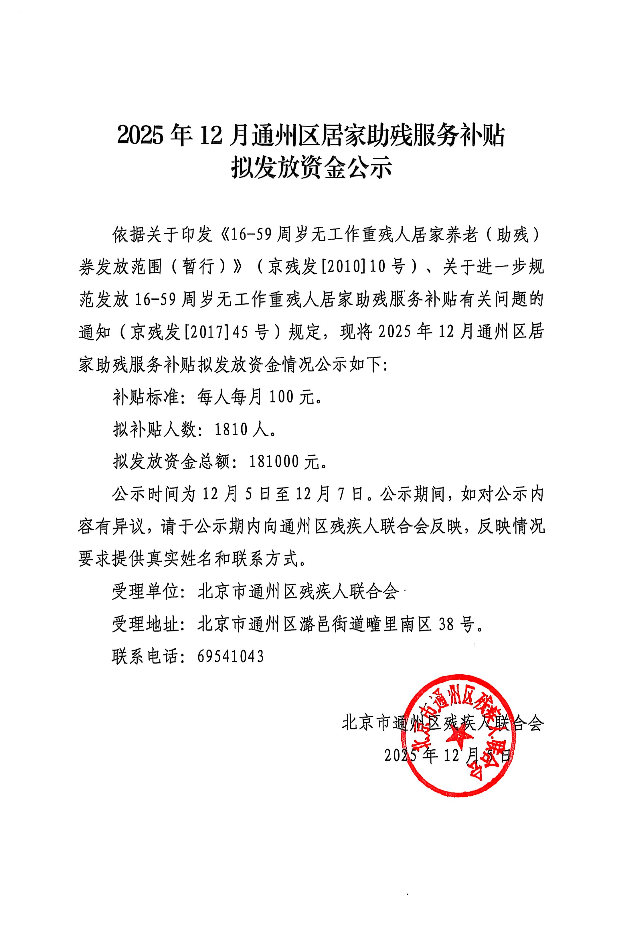 2025年12月通州区居家助残服务补贴拟发放资金公示