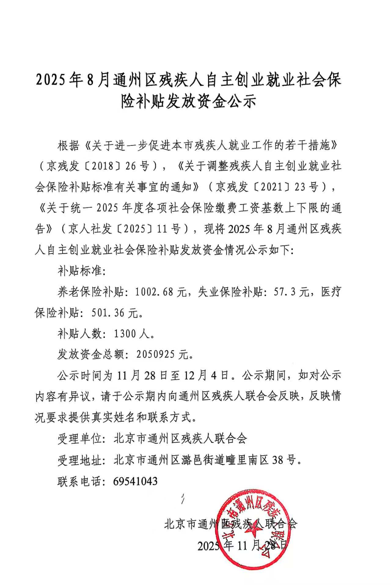 2025年8月通州区残疾人自主创业就业社会保险补贴发放资金公示